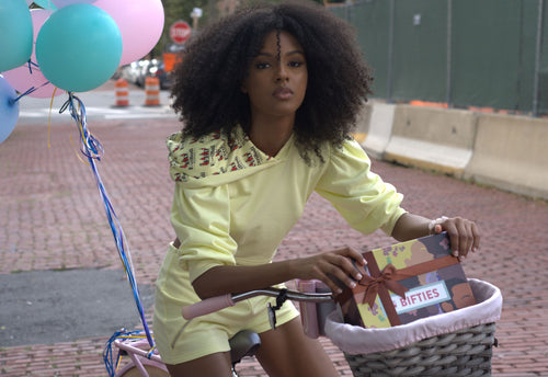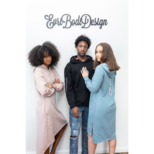 Models wearing size small in dresses shown. Black sweatshirt shown in medium.